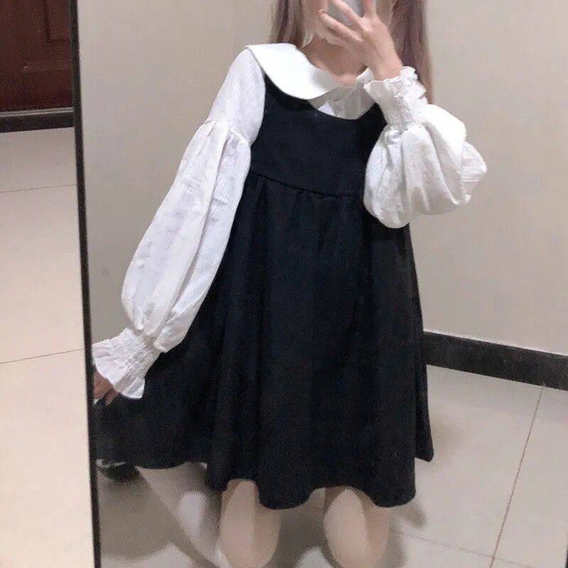 春夏季套装女学生韩版设计感娃娃领衬衫+显瘦背心连衣裙两件套潮热门设计联盟服务商