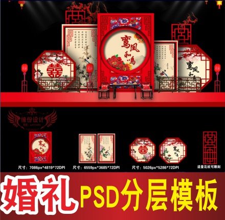 婚礼背景设计中式红色主题迎宾区签到区喷绘PSD格式模板素材B618热门设计联盟服务商