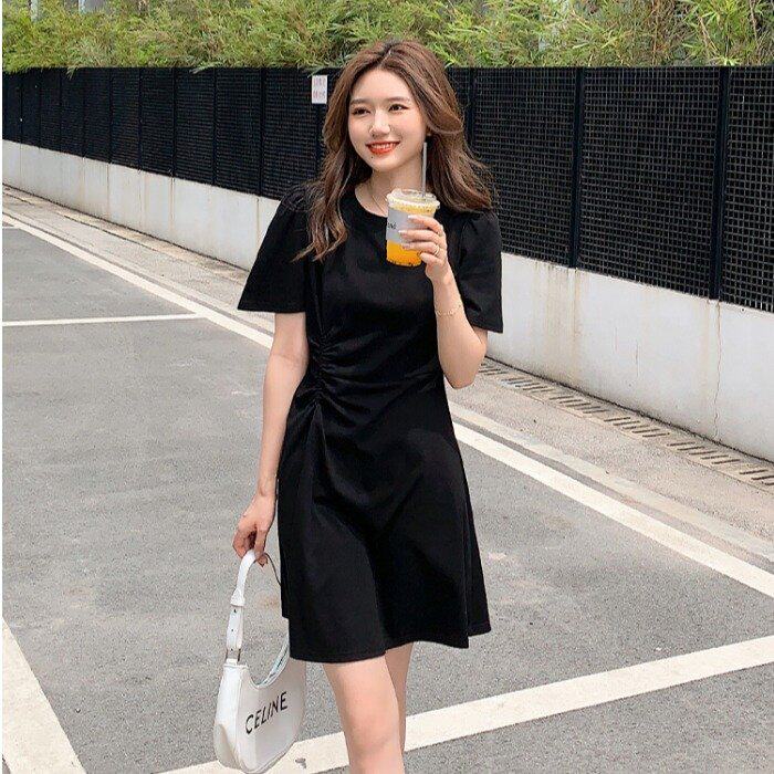 韩版夏季气质休闲设计感恤裙棉纯色抽褶圆领短袖收腰显瘦连衣裙热门设计联盟服务商